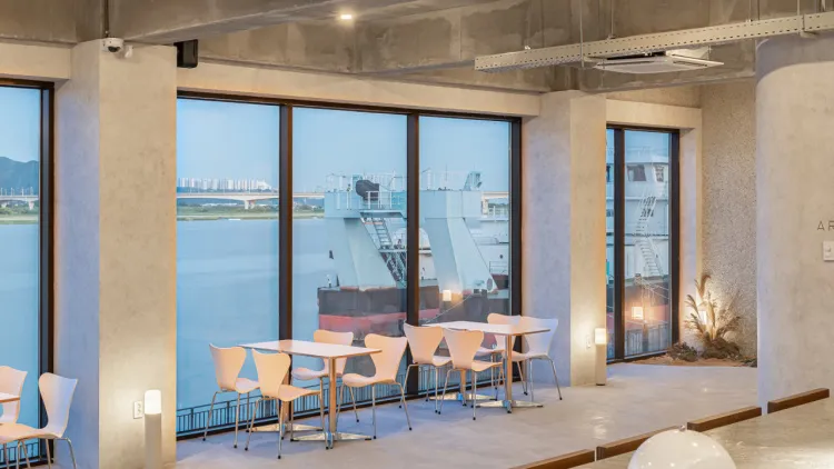 주문은 1층에서 하면 된다. 메뉴는 커피, 핸드드립 커피, 차와 밀크티, 에이드, 주스 등 논커피, 크로플 등 다양하게 취급하고 있다. 2층과 3층에는 탁 트인 낙동강 전망의 좌석이 많이 준비되어 있다.