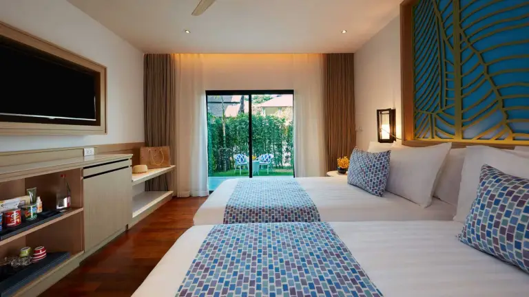디럭스 트윈룸은 내추럴한 무드의 가든뷰 객실이다. 트윈 베드가 있으며 최대 3인까지 투숙 가능하다. 넓은 개별 발코니도 있어 시간을 보내기 좋다.