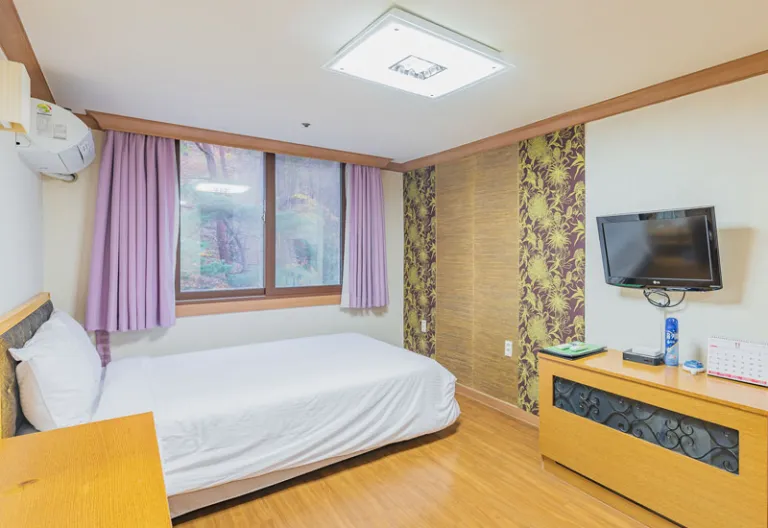 거실에 더블베드 1개가 놓여 있고, 침실에 싱글베드, 그리고 여분의 침구 1세트가 준비되어 있어 최대 3인까지 투숙 가능하다. 그밖에 TV, 에어컨, 소파, 테이블, 옷걸이, 화장대 등을 갖췄다.