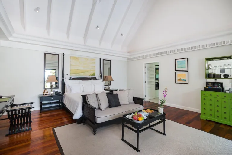 풀빌라 객실은 탁 트인 바다 풍경을 즐길 수 있으며 선베드도 놓여 있다. 객실은 전통적인 분위기와 함께 세련된 인테리어로 눈길을 끈다.