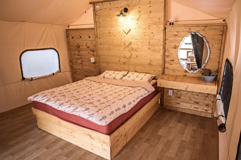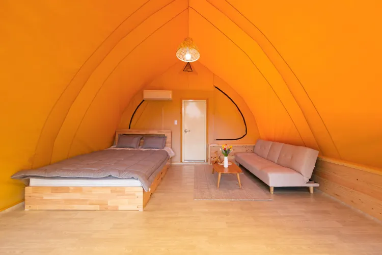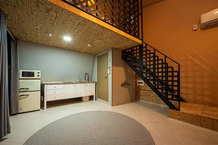 글램핑 객실 내부는 복층으로 이루어져 있어, 성인 3인까지 투숙이 가능하다.