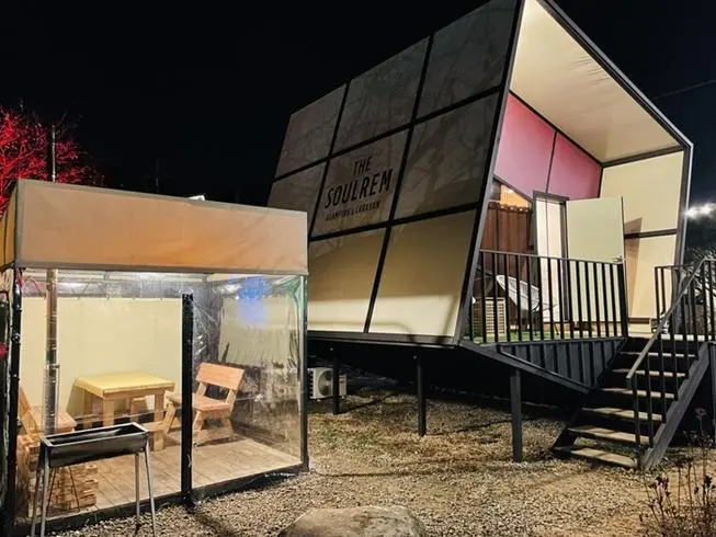 더설렘의 객실은 깡통 모양의 카라반과 큐브 모양의 글램핑 객실로 멀리서도 돋보이는 외관을 자랑한다.