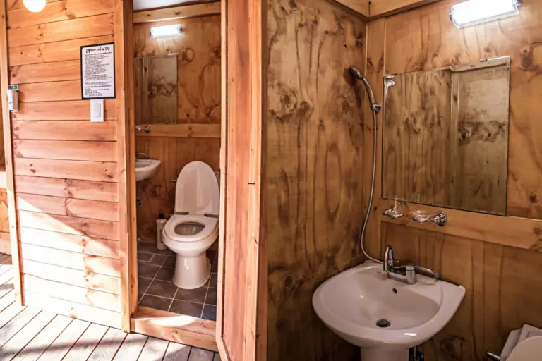 더설렘 글램핑동의 모든 객실에는 개별 화장실 겸 샤워실이 준비되어 있다. 어메니티가 준 호텔급으로 갖춰져 있어 투숙객들의 후기가 좋은 편이다! 샴푸, 린스, 바디워시, 비누, 치약, 칫솔, 수건 등 웬만한 건 다 준비되니 몸만 가볍게 오셔도 된다.