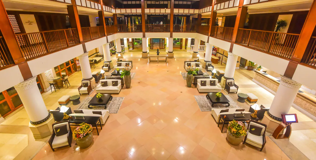 층고가 높은 메인 로비에는 푹신한 소파를 배치해 놨다. 풀빌라 객실까지는 버기카로 이동하게 된다.
