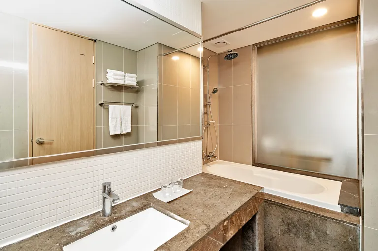 욕실에는 욕조가 설치되어 있으며, 어메니티로는 샴푸, 샤워젤, 비누와 바디스펀지, 수건, 헤어드라이어까지 준비되어 있다. 치약과 칫솔, 면도기는 제공되지 않으니 개인적으로 준비해오시거나 숙소 내부 편의점에서 구매하면 된다.