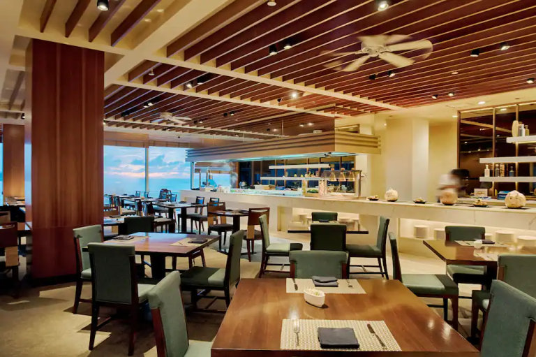 조식은 괌 롯데호텔 레스토랑 라세느에서 오전 7시부터 10시까지 운영된다. 주중에는 단품으로, 주말에는 뷔페로 제공된다. 뷔페에는 한식과 일식을 포함해 동서양의 메뉴를 고루 갖췄다. 라이브 코너의 우동이 특히 인기이다.