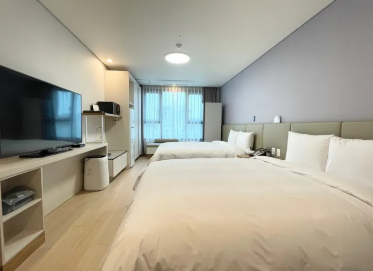 패밀리 트윈룸은 깨끗한 신식 시설로 모던한 스타일의 객실이다. 객실에는 침대 2개가 놓여 있으며 소파도 비치되어 있다.