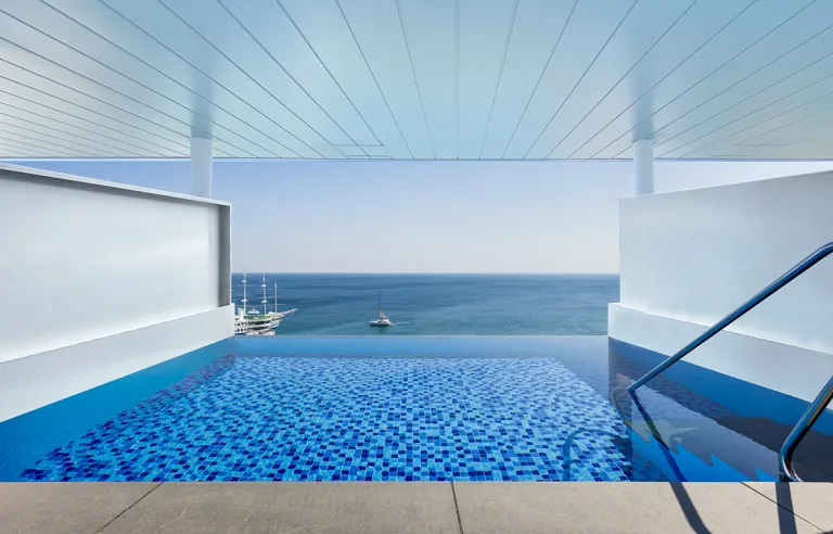 정동진 비치크루즈의 프라이빗 인피니티 풀빌라 객실은 단독 수영장을 보유하고 있다. 따뜻한 온수 인피니티 풀에서 사계절 내내 물놀이가 가능하다.