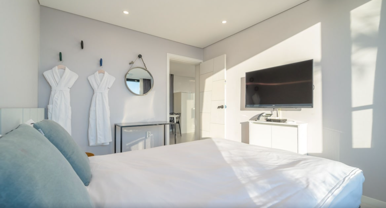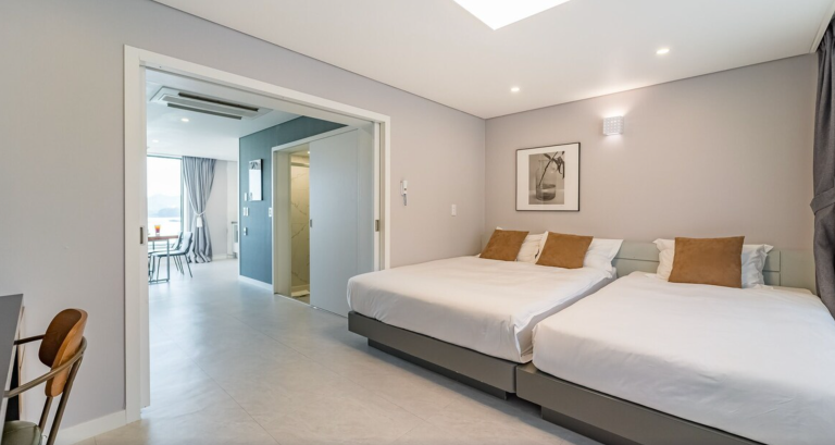 디럭스 룸의 구성은 더블베드1+싱글베드1+주방+거실+욕실+욕조로 구성되어 있다.