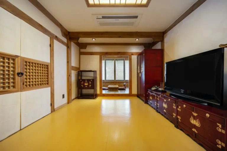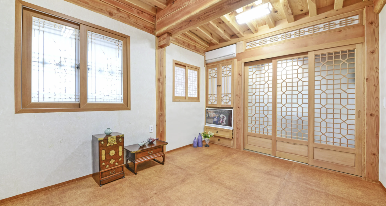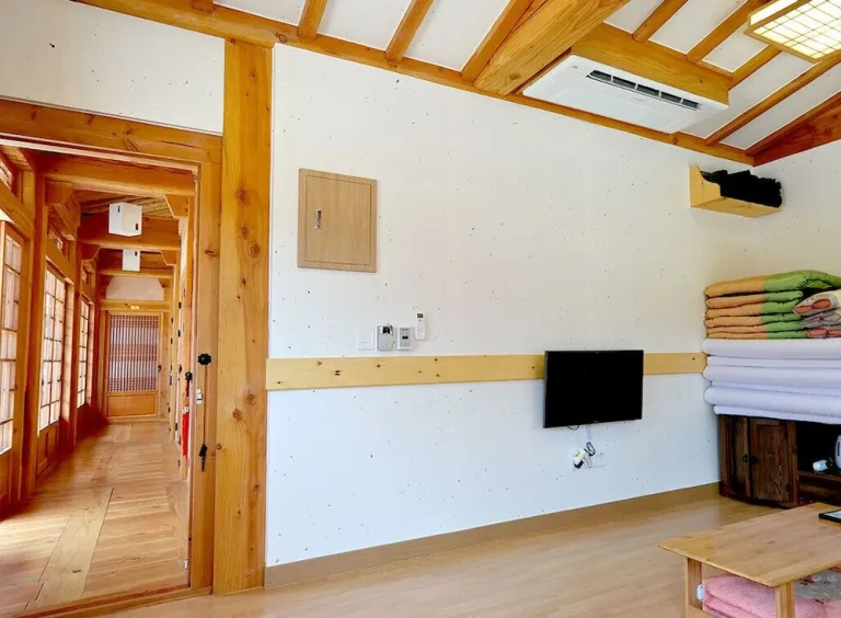 채광이 좋아 한옥 느낌을 제대로 받을 수 있다. 수건, 헤어드라이기, 수건, 칫솔, 샴푸, 컨디셔너, 비누가 제공된다.