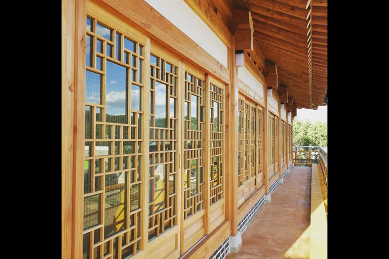 객실 내부가 예뻐서 계속 사진 찍게 돼요. 한옥 건물이지만 내부는 현대식으로 인테리어한 느낌이다. 통창문 밖으로 대나무가 푸른 하늘이 보인다. 한국스러운 전통 장식품이 인테리어의 세련됨을 더해주고 있다.