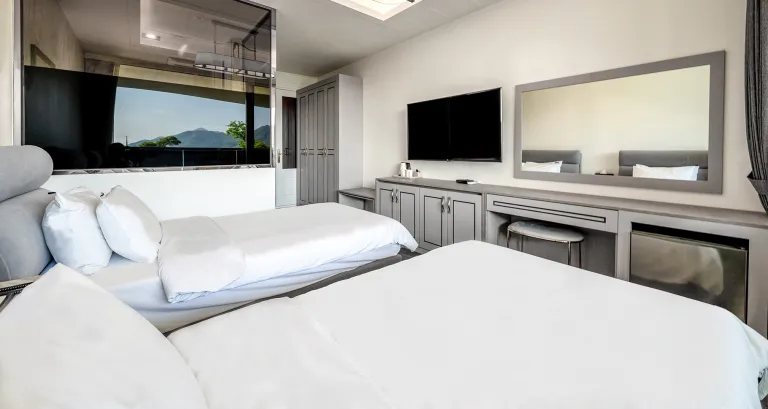 객실 내부에는 침대를 비롯해 TV, 에어컨, 냉장고, 옷장, 화장대 등이 구비되어 있다.