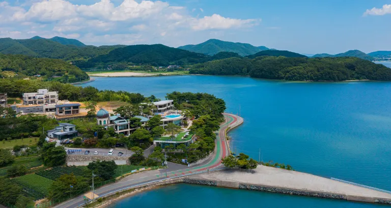 해안 도로에 맞닿아 있는 고성 한산 마리나리조트는 유럽풍 외관과 이국적인 조경까지 마치 해외에 온 듯한 기분을 만끽할 수 있다. 그뿐만이 아니라 초호와 요트와 수영장 등 다양한 체험까지 경험할 수 있다.