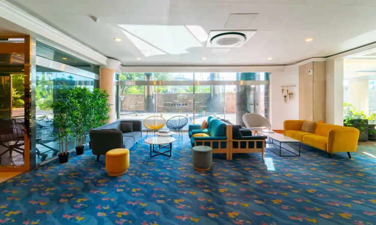 속초 팜파스리조트 로비는 다양한 색감의 감각적인 인테리어로 넓은 휴게 공간이 꾸며져 있다. 로비에서 간편하게 카페를 이용할 수 있도록 준비 중이다.