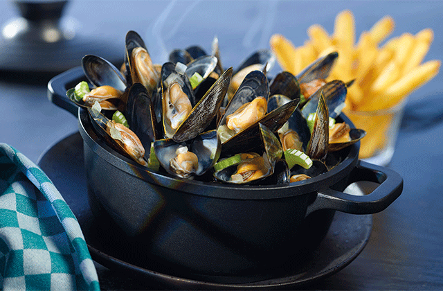 홍합 요리를 주문하면 감자튀김과 소스에 찍어 먹는 바게트가 무제한 리필이기 때문에 양도 넉넉. 추천하는 홍합 요리로는 치즈가 잔뜩 들어간 홍합 그라탕.