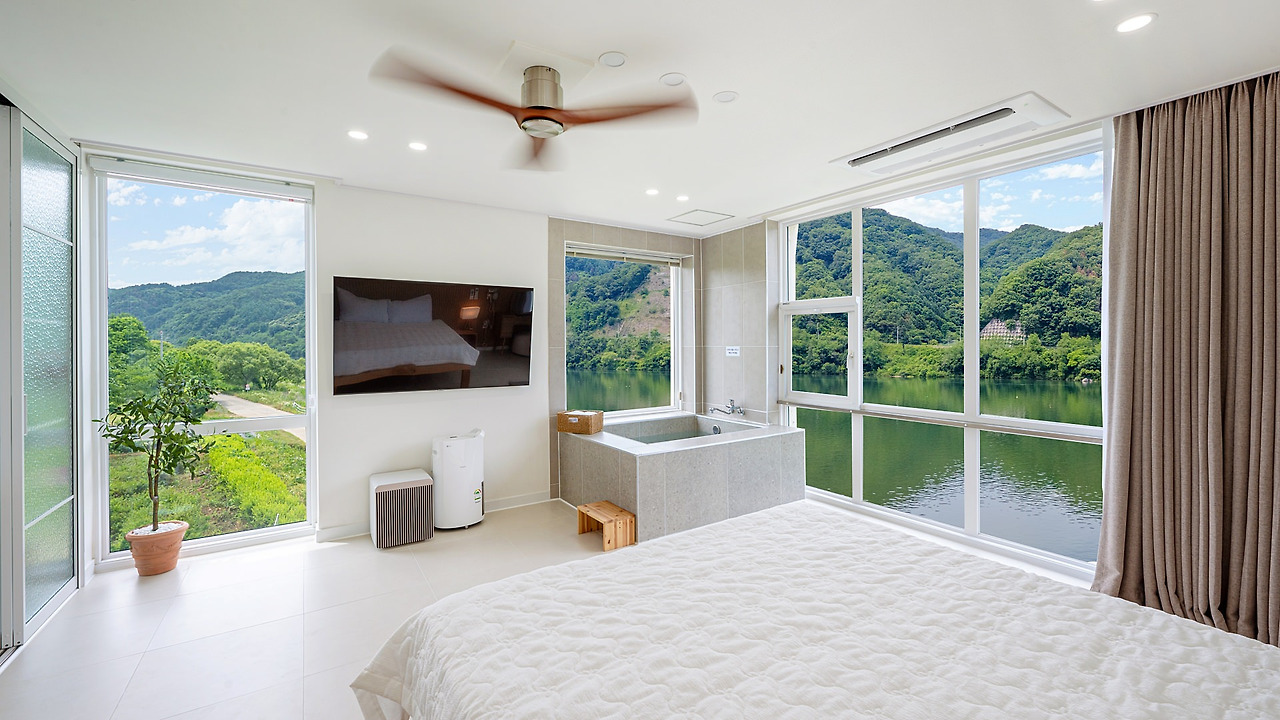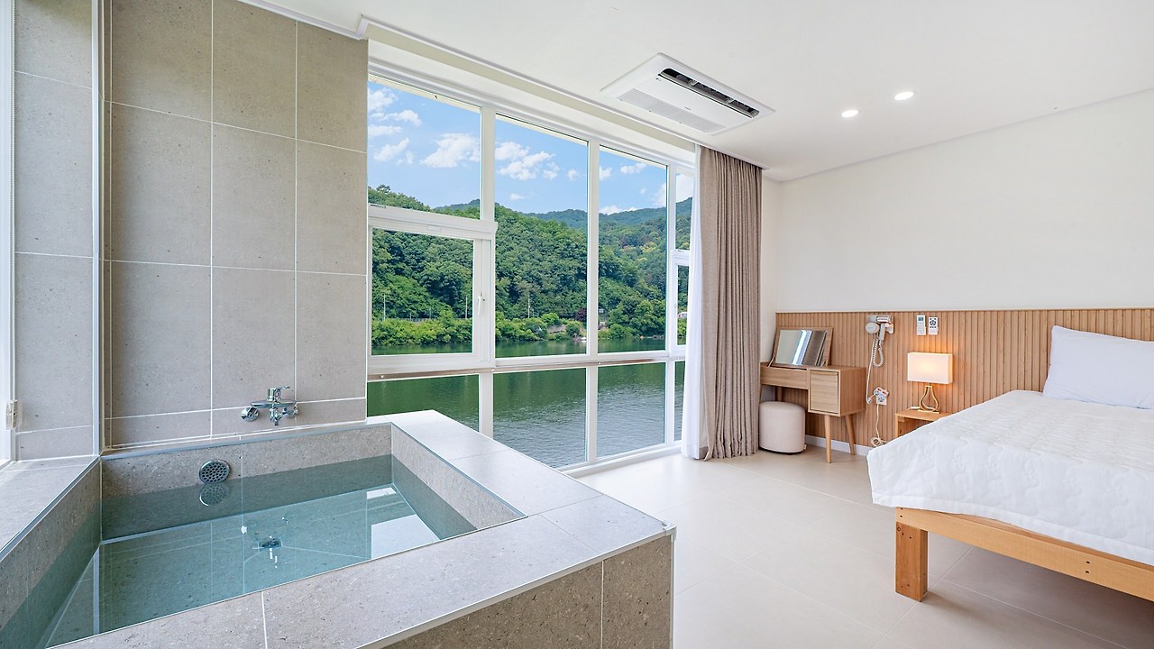 자쿠지룸은 커플 여행객들이 특히 선호하는 객실로, 온수 자쿠지가 무료 제공되어 편안한 휴식을 즐길 수 있다. 대표 객실로는 리버뷰 자쿠지룸, 더블 자쿠지룸, 리버뷰 더블룸 등이 있다. 모든 객실은 감각적인 인테리어와 넓은 창을 통해 북한강 전망을 감상할 수 있다. 커플, 혼자 여행객에게 추천되는 아늑한 공간이다.