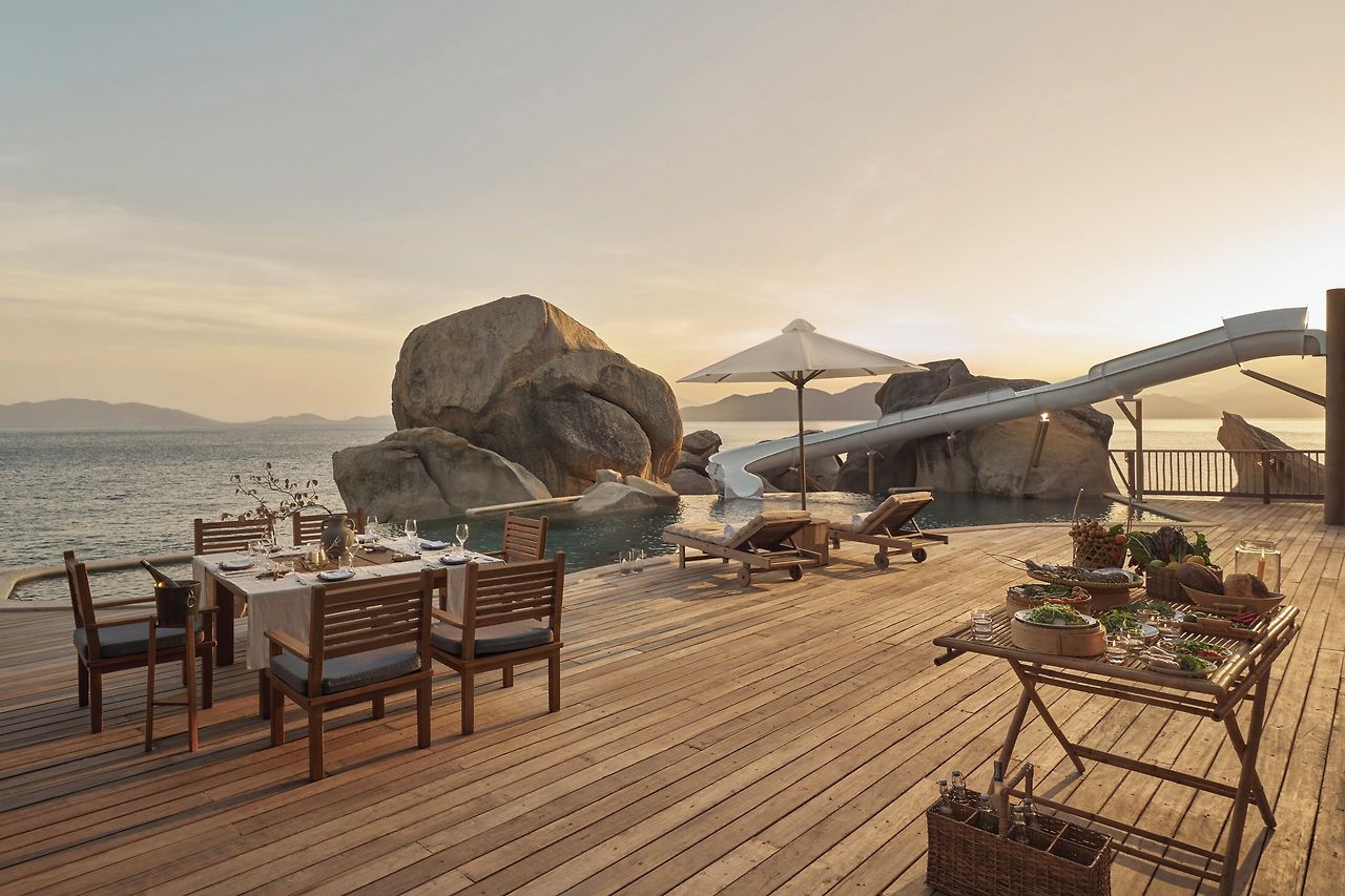 가족 단위 여행자에게 가장 추천하는 객실은 ‘락 리트리트’이다. 암석 위에 자리한 이 객실은 최대 9명까지 수용할 수 있는 대형 빌라이다. 세 개의 침실과 프라이빗 풀, 야외 욕조, 전용 선덱이 있으며, 가족 모두가 여유롭게 머물 수 있다. 특유의 친환경 소재 인테리어와 전용 버틀러 서비스가 제공되어 럭셔리한 나트랑 가족여행에 완벽한 선택이다.