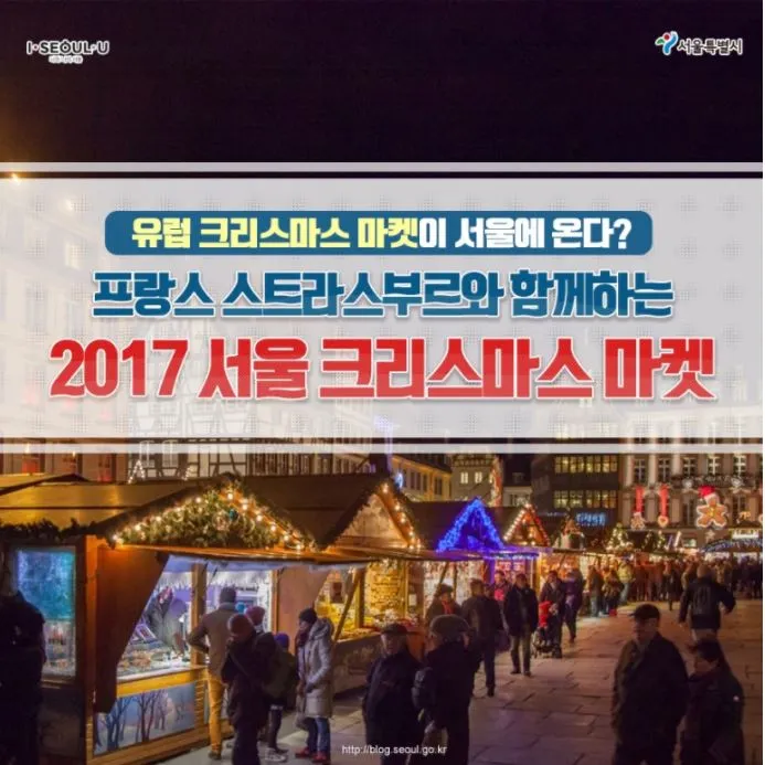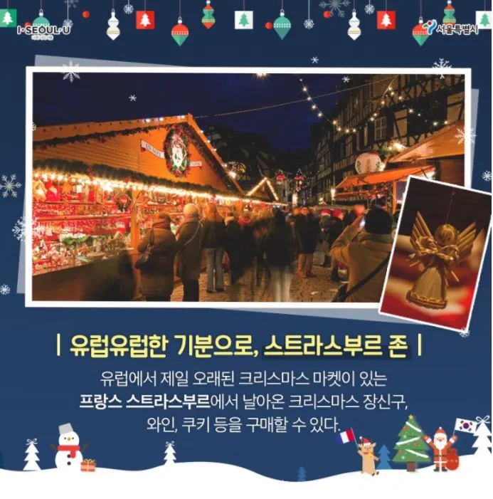 유럽 3대 크리스마스 마켓으로 손꼽히는 프랑스 스트라스부르와 함께하는 서울 크리스마스 마켓이 여의도 한강공원 이벤트 광장에서 열린다. 프랑스에서 온 전통 오두막 장식과 화려한 조명, 프랑스 장인들이 제작한 크리스마스 공예품과 먹거리, 유럽식 음료까지 모두 만나볼 수 있다. 또 다양한 행사와 함께 60대의 푸드트럭, 체험 프로그램 등을 경험할 수도 있다. (사진 출처 : 서울시 공식 블로그 )