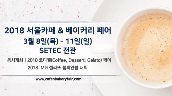 한파가 아닌 꽃샘추위가 오고 슬슬 꽃봉오리가 올라오는 3월, SETEC에서 2018 서울카페&베이커리 페어가 열린다. '커피를 더 맛있게 마셔 봄'이라는 문구로 봄을 맞이하는 컨셉이다. 커피카페&베이커리 페어에 걸맞게 커피와 디저트, 베이커리류는 물론 젤라또와 제과제빵 용품, 홈카페 용품, 테이블웨어에다가 카페 창업아이템까지 커피와 디저트에 관심이 많은 사람에게 볼 것이 아주 많은 박람회다. 또 2018 코디젤(Coffee, Dessert, Gelato) 페어와 2018 IMG 젤라또 챔피언쉽 대회도 함께 열린다고 하니 시간 내서 방문할 만하다. 목요일부터 주말까지 넉넉하게 진행되니 꼭 참여해보길 바란다.