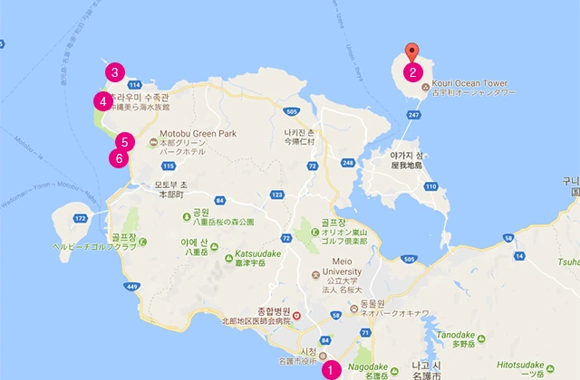 부세나 해중공원 - 코우리대교 - 후쿠기 가로수길 - 츄라우미 - 토구치항 석양 - 이자카야 카이