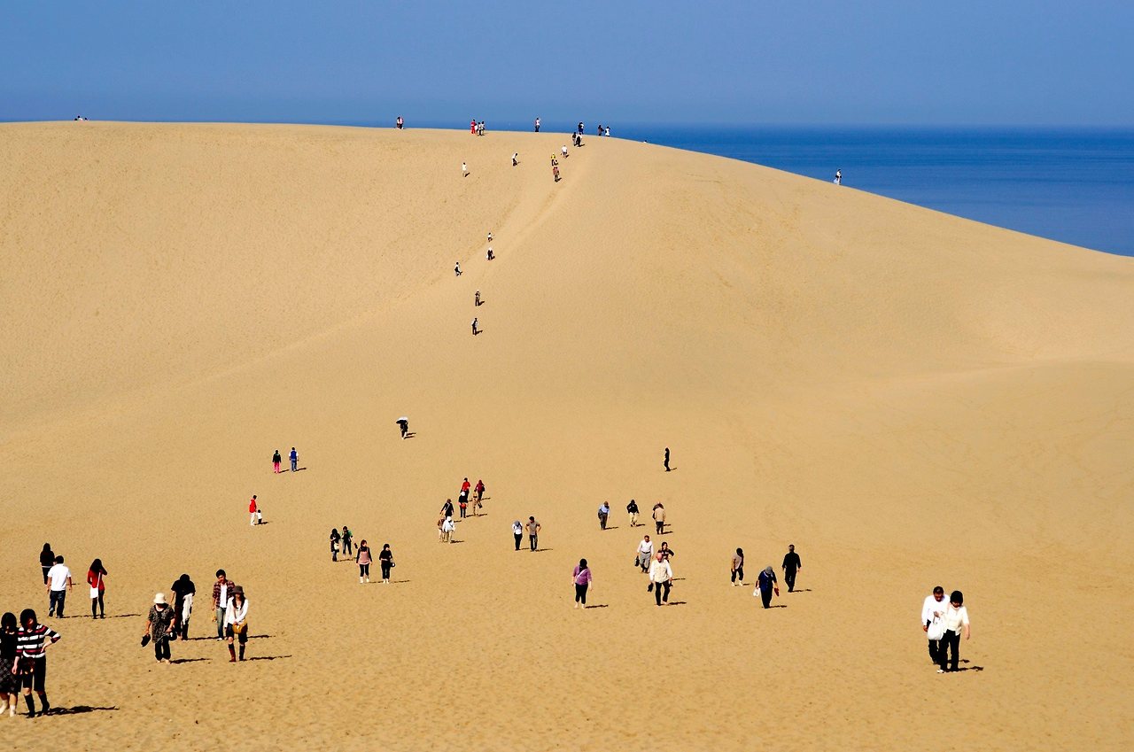 돗토리 사구는 일본 최대 규모의 사구이며 일본 3대 사구 중 하나다. 낙타를 타고 모래언덕 관광이나, 기념사진 등을 즐길 수도 있고 패러글라이딩이나 샌드보드 체험도 즐길 수 있다.
