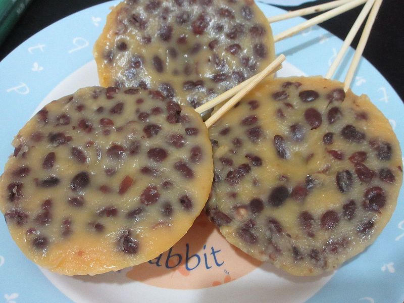 정체를 알 수 없는 생김새지만, 팥을 넣은 찹쌀 푸딩 정도로 생각하면 된다. 쌀가루와 팥으로 만든 달콤하고 담백한 요리를 볼에 넣고 굳힌 후, 막대기에 꽂아 막대사탕처럼 제공한다. 최근에는 호박, 녹차맛도 등장해 즐거움을 더해준다. 호불호 없이 즐기기 좋은 간식이다.
