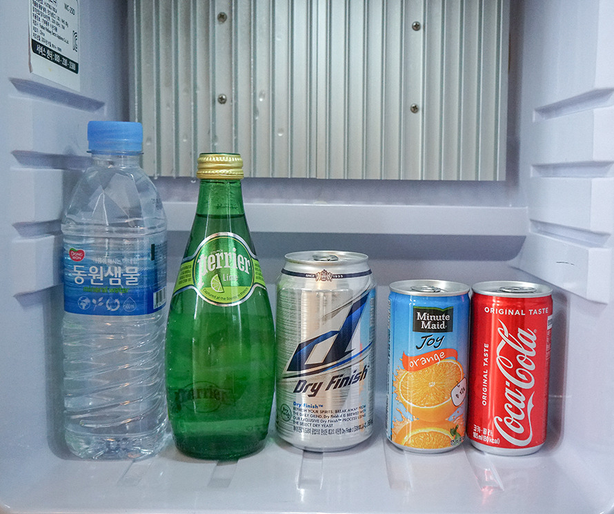 미니바에 서랍을 열면 금고도 자리하고 있다. 별도의 요금 부과 시 세탁도 가능하다. 미니바는 아래와 같은 구성. 당연히 별도의 요금이 부과된다. 근처에 편의점이 많으니 편의점을 이용해보는 걸 추천한다. 왜냐하면 미니바의 공간이 꽤 넉넉해서 청담역에서 내려오는 길에 편의점에서 사 온 맥주 한두 캔 정도는 충분히 넣을 수 있기 때문.
