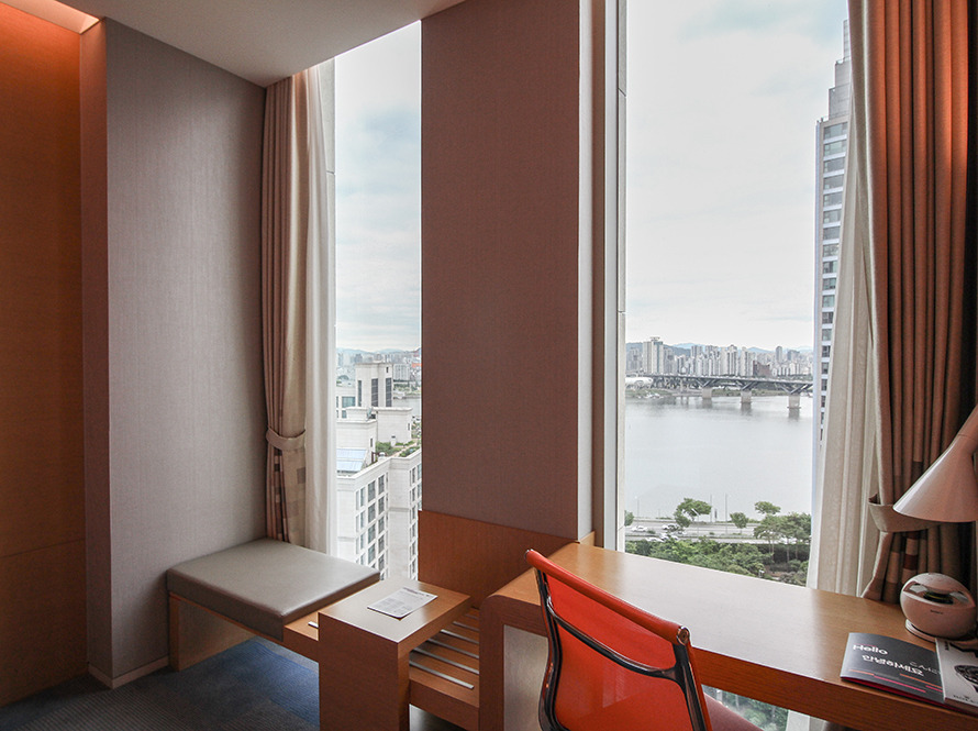 시크룸 역시 워킹데스크가 구비되어 있다. 업무를 할 필요가 없다면 왼쪽 의자에 앉아 한강을 바라보며 남기는 삼각대 대용으로 써도 좋을 것이다. 또 책상과 유리창이 가까이 자리하고 있으니 한강의 뷰를 타임랩스로 담아보는 것도 추천한다. (휴대폰으로 타임랩스 앱만 깔면 그럴싸한 타임랩스를 촬영할 수 있다)