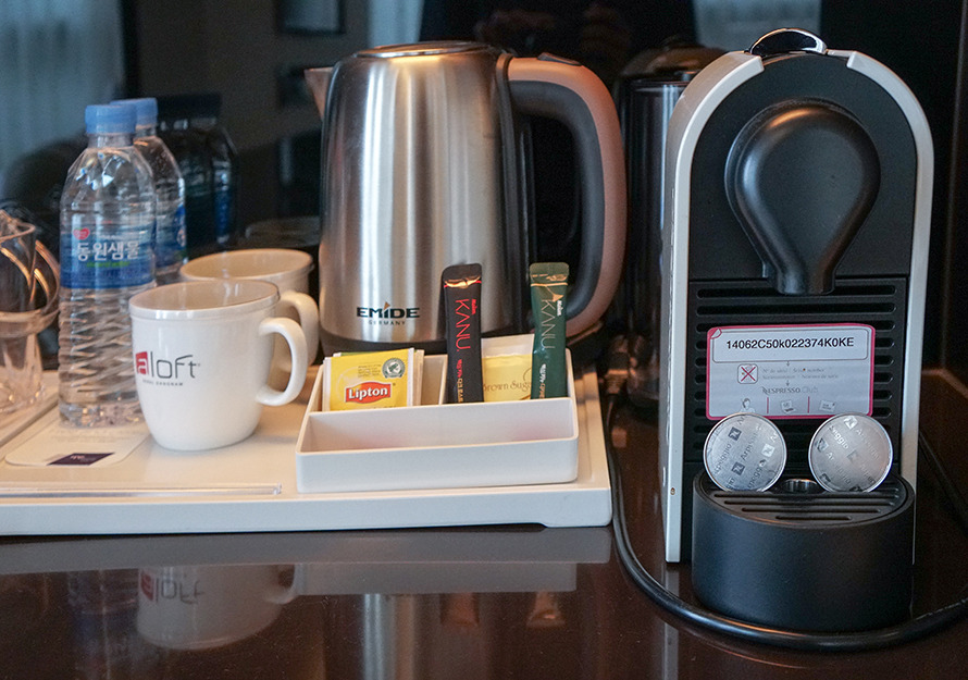 알로프트 강남 스위트룸과 시크룸에만 구비되어 있는 네스프레소 캡슐 커피 머신. 차, 커피, 물과 함께 별도의 비용 지불 없이 이용 가능하다.