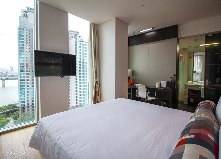 욕실은 실용성 있게 구성되어 있다. 세면대를 중심으로 샤워실, 화장실이 분리되어 있다. 조식 시간과 체크아웃 타임에 쫓긴다고 해도 불편함 없이 이용이 가능하다. 주목해야 할 곳은 욕실. 폭이 넓고 큰 욕조가 한강을 마주하고 자리하고 있다. 목까지 찰랑찰랑 넘치게 뜨거운 물을 받아두고, 바쁜 한강을 바라보는 시간은 호캉스의 참 의미를 깨닫게 해줄 것이다. 물론 건너편 아파트에서 욕실이 보일 일은 없지만, 부담이 된다면 블라인드를 내려서 바깥세상과의 완벽한 차단을 해도 좋다.