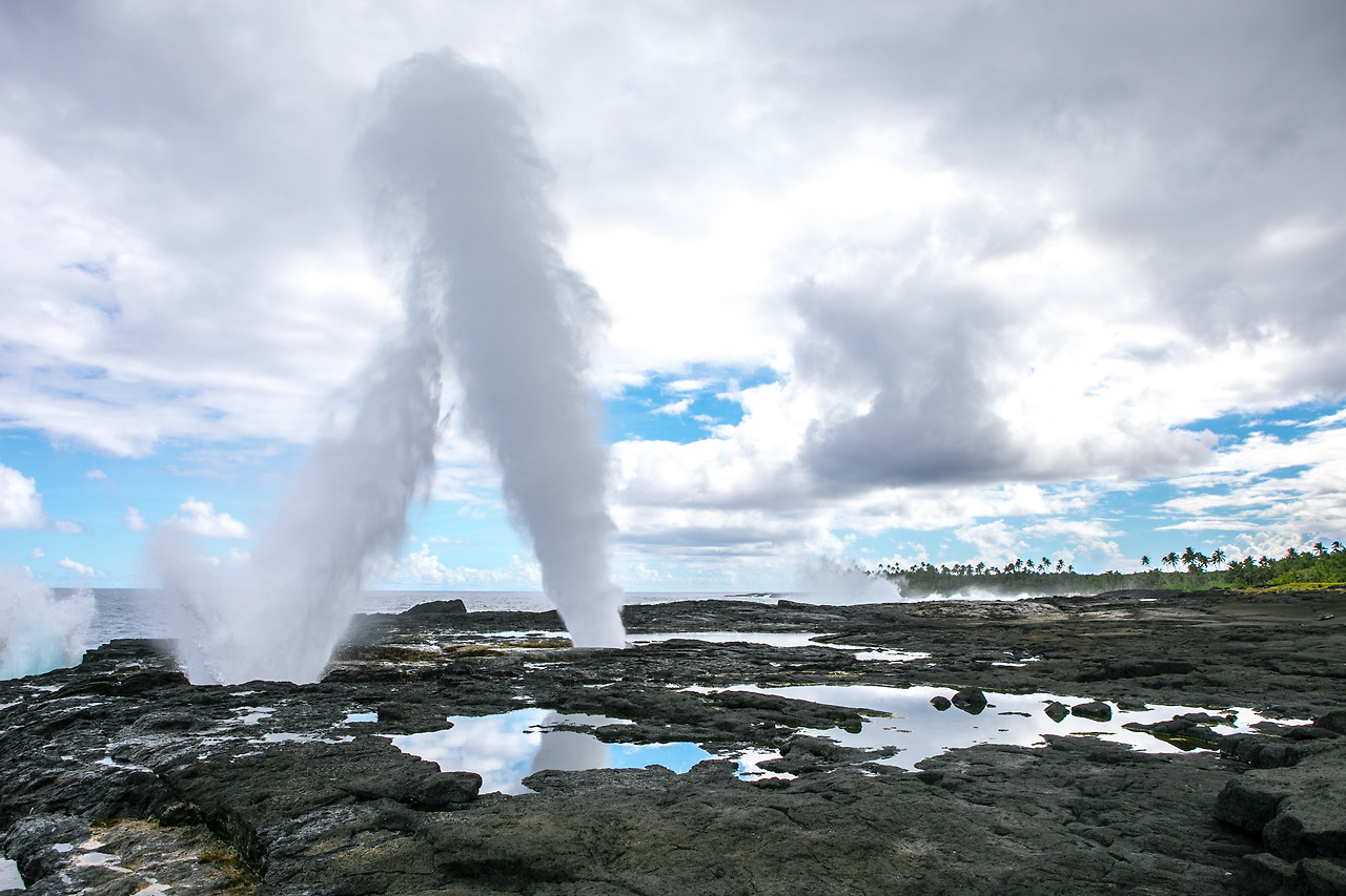 아름다움을 넘어 자연의 신비를 눈 앞에서 볼 수 있는 곳이 또 있다. 영화 ‘모아나’에서 주인공이 바닷가를 달려갈 때 음악에 맞춰 마치 분수처럼 물이 뿜어져 나오는 장면이 있는데, 단지 애니메이션의 상상력에 의해 만들어진 것이 아닌 실제 있는 곳을 그려 넣은 것이라 해서 깜짝 놀랐다. 알로파아가 블로홀(Alofa’aga Blow Holes)은 영어 단어 블로홀이 알려주듯 고래 등의 호흡공처럼 물이 뿜어져 나온다. 그 안에다 코코넛을 던져 넣고 기다리면 파도가 밀려오는 시간에 맞춰 커다란 물줄기와 함께 코코넛이 날아오르는 멋진 장면이 연출되는데, 이 역시 화산활동 당시 바닷가의 용암들이 굳으면서 빠져나간 공기구멍이 바닷가 바위틈에 생겨났고 거기에 고인 물을 파도의 강한 수압으로 밀어 올리면 분수처럼 솟구치게 되는 것이다. 솟구쳐 오르는 물기둥의 소리와 이따금 그 물보라에 생기는 무지개가 곁들여지면 정말 놀라운 장관을 경험할 수 있다.