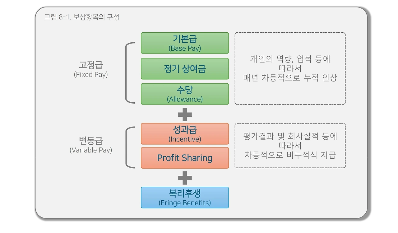 - 임금형태(Pay Mix 또는 Method of Wage) 관리의 주요 이슈는 스톡옵션(Stock Option)이나 때로는 사이닝 보너스(Signing Bonus), 리텐션 보너스(Retention Bonus) 등을 언급할 수 있으나 무엇보다 중요한 주제는 성과급(Incentive)이라고 할 수 있습니다. 성과급은 사기업은 시행하지 않는 회사를 찾기가 어렵고, 공기업 등 공공 영역에서도 폭넓게 활용되고 있습니다. 성과급이라는 것은, "개별 종업원이나 집단이 수행한 노동성과나 업적을 기준으로 임금을 산정하여 지급하는 임금형태13)"를 의미하는데, 현실적으로는 개인의 평가 결과와 회사의 실적(영업이익이 발생하였는지) 등까지 종합하여 경영성과급이라는 명칭으로도 운영됩니다.