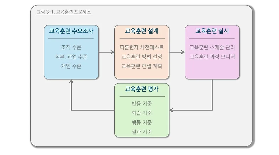- 이러한 교육(인재개발)의 프로세스는 ① 수요조사, ② 프로그램 설계, ③ 실시, 그리고 ④ 평가라는 피드백 과정을 순환하는 방식으로 이루어지게 됩니다. 그리고 실제 현실에서는 신입교육, 멘토링, OJT, 액션러닝(Action Learning), 리더십 교육, 직무교육뿐만 아니라 각종 조직문화 프로그램 등으로 보다 구체화되고 있습니다. 그렇다면 이러한 교육의 영역에서 노동법은 어떠한 기준을 제안하고 있을까요? 수요조사, 프로그램 설계, 실시, 평가라는 4가지의 영역에서 노동법은 어떠한 기준과 최소한의 원칙을 제안할 수 있는지 살펴보려고 합니다.