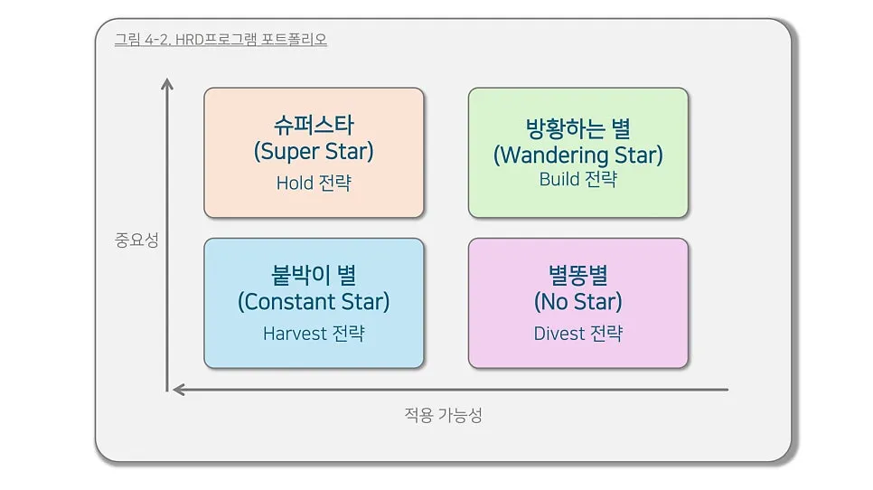 - 교육 프로그램을 적용 가능성과 중요성이라는 2가지 측면으로 구분을 해보자면, PIP의 중요한 부분인 교육 프로그램은 "방황하는 별"에 해당된다고 볼 수 있습니다. 중요성은 분명히 낮지 않은데, 구체적으로 구성원의 능력개발을 하기가 쉽지 않고, 그를 통해서 저성과자를 고성과자로 바꾸는 것도 상당히 어렵기 때문이죠. 그렇기 때문에, 이러한 교육 프로그램은 실패할 가능성도 높고, 경영진 입장에서도 "꼭 해야 되나?"라는 이야기가 나오기 쉽습니다. 하지만, 조직 입장에서 그 중요성이 앞으로도 낮아지지는 않을 것 같습니다. 우리나라 노동법 체계에서 직원을 해고하는 것은 매우 어렵고, 구인난도 심해지는 상황에서 그나마 뽑은 인재가 회사와 Fit이 맞지 않는 경우는 언제든지 발생할 수 있으니까요. 또한 회사 입장에서 보았을 때 문제가 되는 인력이 조직 분위기를 흐리는 경우를 경영진은 무엇보다 싫어하죠. 그렇기 때문에, PIP와 그에 수반되는 교육 프로그램은 지속적으로 만들어가고 개선해 나가는 "Build"전략을 지향해야 하는 것은 분명 맞다고 생각됩니다. 이러한 일련의 저성과자 관리 프로그램은 개인적으로 관심을 가지고 있는 분야이기도 합니다.