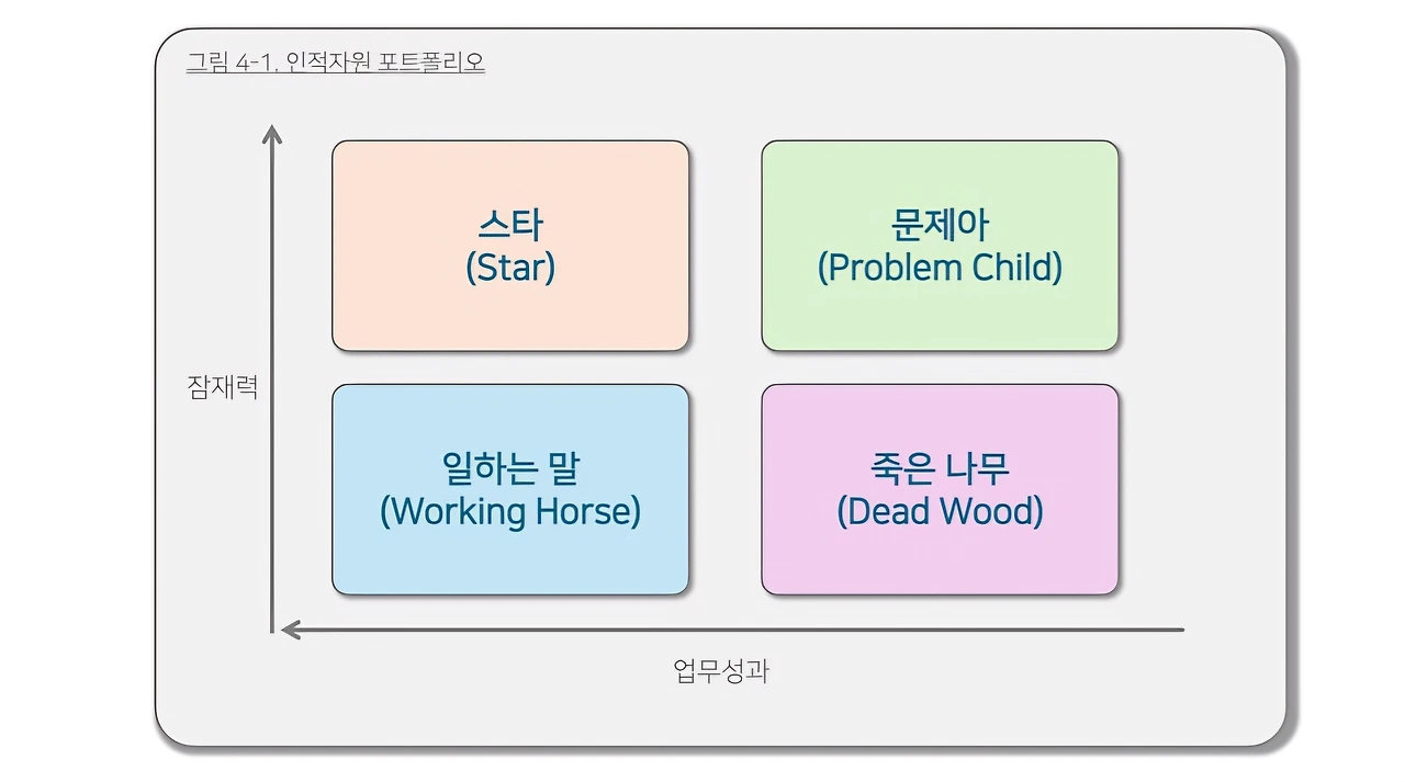 - 인적자원을 업무성과와 잠재력을 기준으로 2x2 Matrix를 통해서 분류하자면 크게 4가지로 분류할 수 있는데, 어느 조직이든 업무성과는 낮고, 잠재력도 낮은 인재가 있을 수밖에 없습니다. 그런 인재를 저성과자라고 부르든, 아니면 C-Player라고 부르든, 아니면 아래의 분류와 같이 "죽은 나무"라는 명칭으로 분류를 하든 간에 말이죠. 조직 입장에서는 그러한 인재가 알아서 나가주면 정말 고맙긴 한데, 제 경험상 어떤 직원들도 자기가 평균이하의 인재라는 것을 스스로 인정하는 것을 본 적이 없었습니다. 아무리 평가결과가 낮게 나온다고 하더라도 그것은 본인의 역량 문제가 아니라, 회사의 탓 또는 회사 평가 시스템의 탓을 하는 경우를 많이 봐왔습니다. 실제 회사의 평가시스템이 합리성을 가지고 있느냐의 문제를 떠나서, 그만큼 소위 저성과자 관리는 회사 입장에서는 참으로 어렵습니다. 직원 스스로가 본인의 위치를 인정하게끔 하는 것부터가 아주 어려우니까요. 이런 면에서 HR 영역에서 평가도 상당히 중요한데, 관련된 내용은 평가 이야기를 할 때 한번 해보겠습니다.