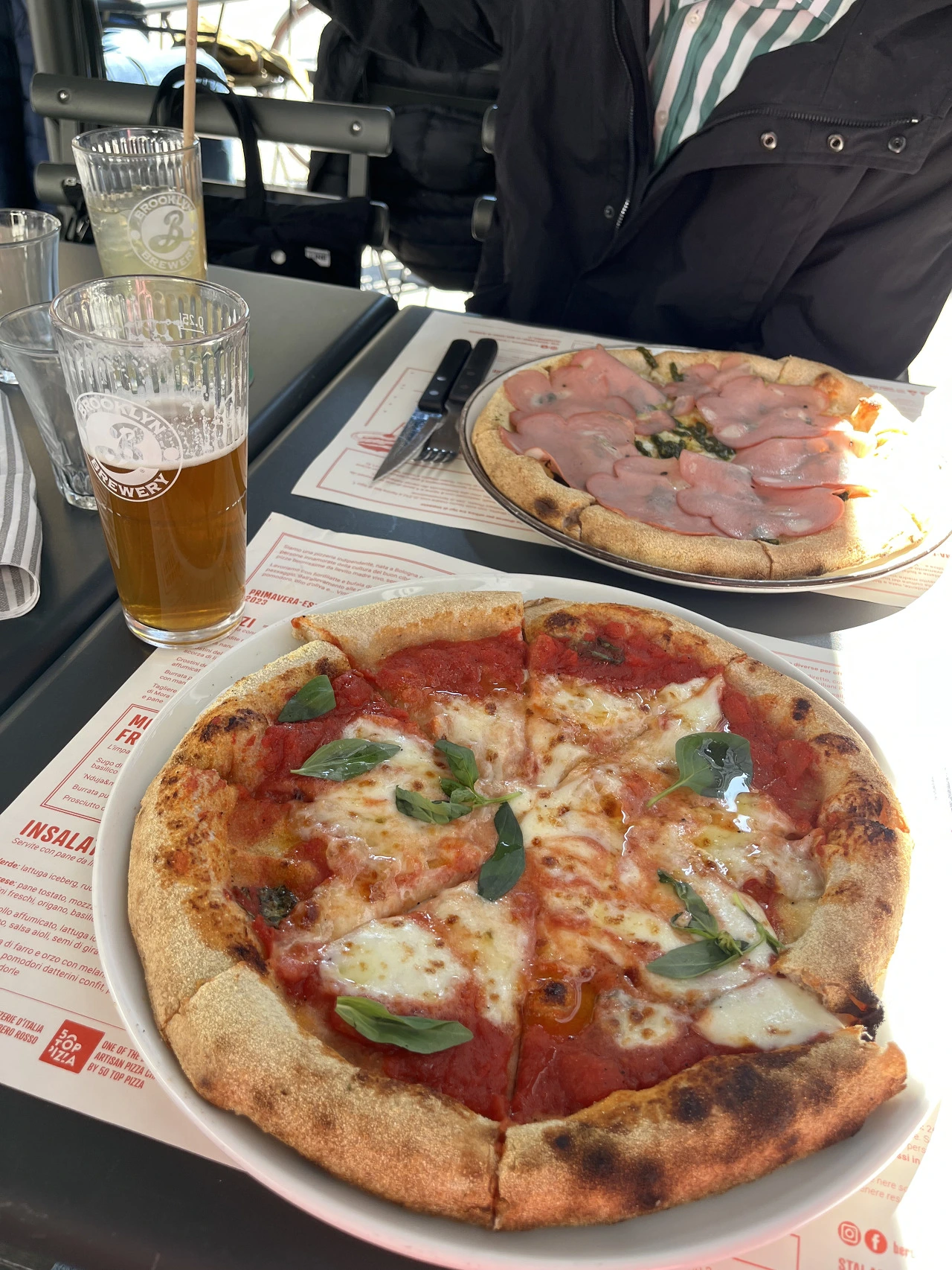 1인1피자를 하자며 나는 화덕피자의 대표메뉴 마르게리따를, 남편은 햄이 올라가 있는 피자를 주문했고 라거맥주와 레몬 스프리츠를 주문했다.