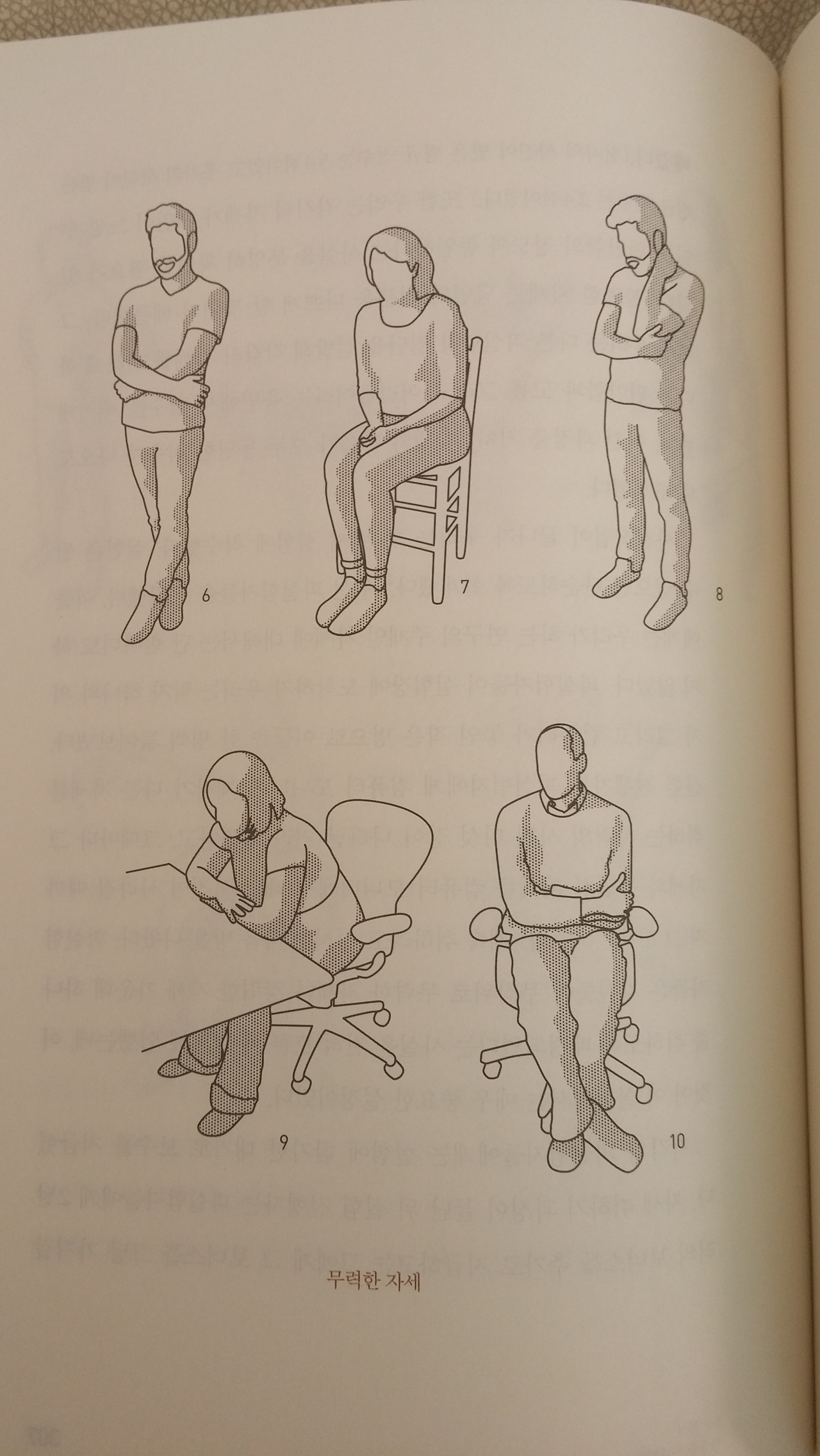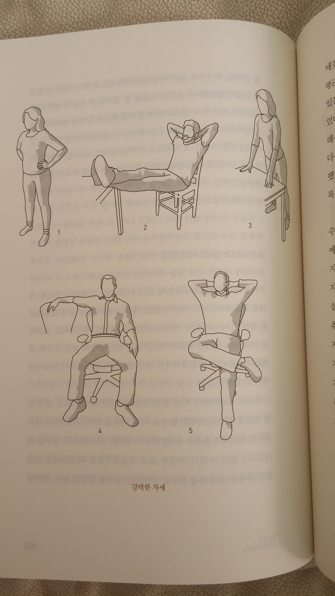 이제부터 의도적으로 강력한 자세를 취해야겠다. 회사 내에서 포즈를 취하기가 어렵다면 혼자 화장실에 들어가 2분 동안이라도 원더우먼 자세를 취하여 자신감을 고취시키겠다. 하루 종일 모니터를 들여다 보고 일을 하다 보니 실제로 목을 움직일 수 없을 정도가 되어 병원에 가보니 거북목이라는 판정을 받았었다. 간단한 물리치료를 받고 끝났지만 의도적으로 자세에 대한 교정을 하지 않으면 나도 모르는 순간에 심리적으로 피폐해질 수도 있겠다는 생각이 들었다.