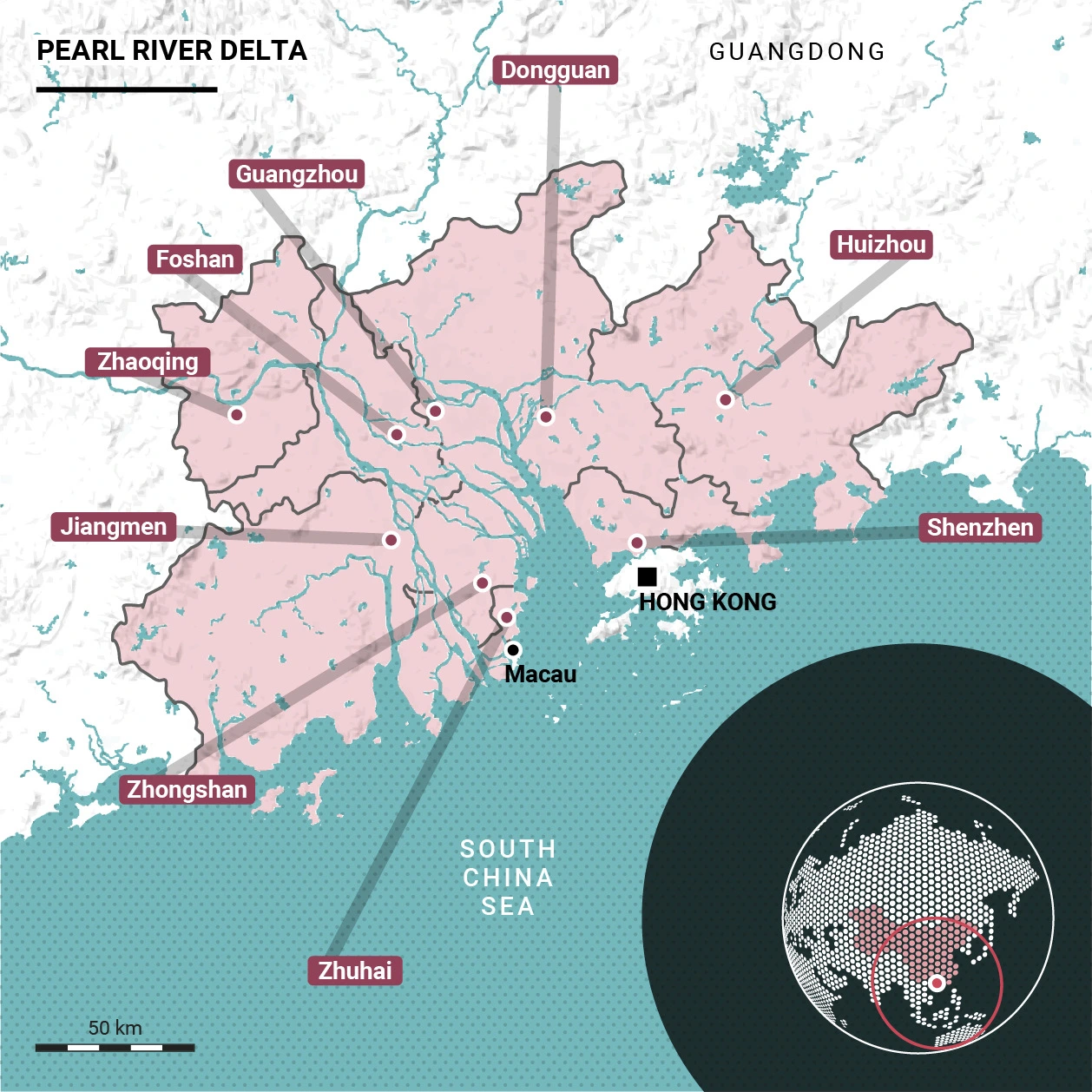 ‘하나의 국가, 두 개의 제도(one country, two systems, 一國兩制])’는 이들의 현재를 설명하는 말이다. 국경을 넘는 범죄인 인도법으로부터 시작된 홍콩과 중국의 갈등은 이전 우산혁명으로도 거슬러 올라간다. 그리고 이는 법적으로 중국의 특별행정구에 해당하는 홍콩, 마카오를 비롯하여 이 도시들의 중국 접경 도시인 선전(深圳)과 주하이(珠海)의 상태와도 연관한다. 이 도시들을 포함하여 주강삼각주(Pearl River Delta; PRD, 珠江三角洲)로 불리는 광둥 성 일대 지역은 중국의 동서부를 연결하며, 중국이 외부와 경제적으로 협력하는 거점으로서, 지속적으로 큰 자본이 유입되는 등 중화권 변화의 중심이 되고 있다. 특히 올해 초 중국은 광둥 성의 9개 도시와 홍콩, 마카오를 하나의 경제특구로 묶는 계획인 GBA(Greater Bay Area)를 발표하기도 했다. 식민지로부터 반환(독립)된 이후에도 영국과 포르투갈의 정치 경제 시스템을 유지하고 있는 홍콩과 마카오는 중국과의 협정에 의해 각각 2047년과 2049년에 중국으로 실질적인 체제 통합을 하게 된다. 중국 정부는 이를 준비하기 위하여 주강삼각주 일대에 많은 투자를 하고 있는 것이며, 점차 그 권한과 통제의 영역을 넓혀가고 있다. 이 접경 도시들의 경제적 개발 속도와 사회 문화적 인프라의 변화는 현격했다.
