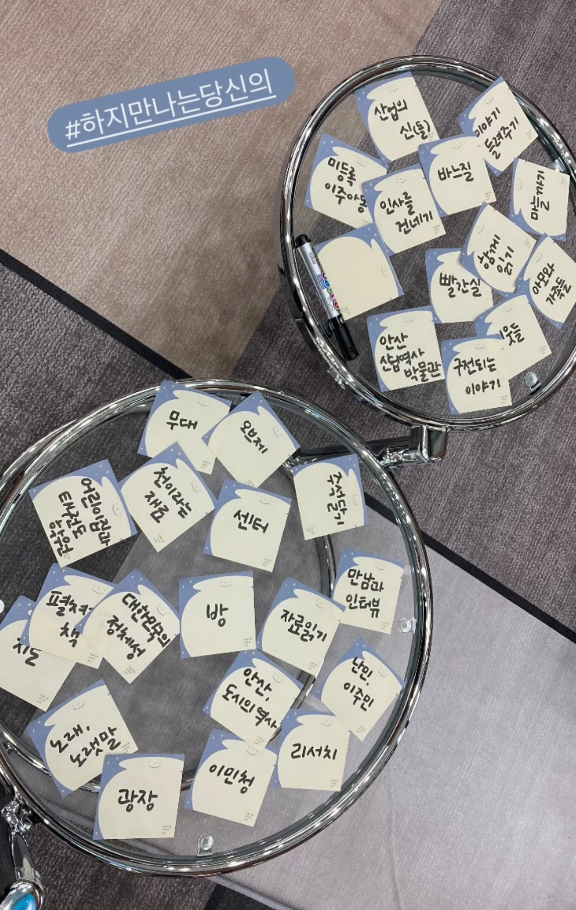 * 도란도란 창작클럽은 키워드로 공연의 여러 요소들을 나열해 두고, 하나씩 단어를 골라가며 작업의 과정과 공연의 특징들을 살펴보는 방식으로 대화를 이어나갔다. 창작자들의 이야기만큼이나 참여한 관객/동료/친구들의 이야기도 중요했기에, 1) 창작자가 이야기를 할 수 있는 시간을 정해두고 진행한 뒤, 2) 관객들의 이야기를 돌아가며 듣고 3) 다시 창작자의 이야기로 돌아오는 방식을 선택했다. 함께 이야기를 하니 우리가 공연에서 다루었던 것들이 더 풍성하고 생생하게 기록되었다. 특히 천과 실이라는 공연 이후 이 이야기가 더 이상 남의 이야기가 아니게 되었다는 말을 들었을 때는 더할 나위 없이 반갑고 고마웠다.