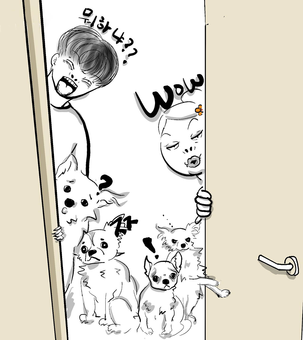 “ 엄마, 강쥐들 데리고 빨리 나가요. 공부하는데 방해 말고요.”