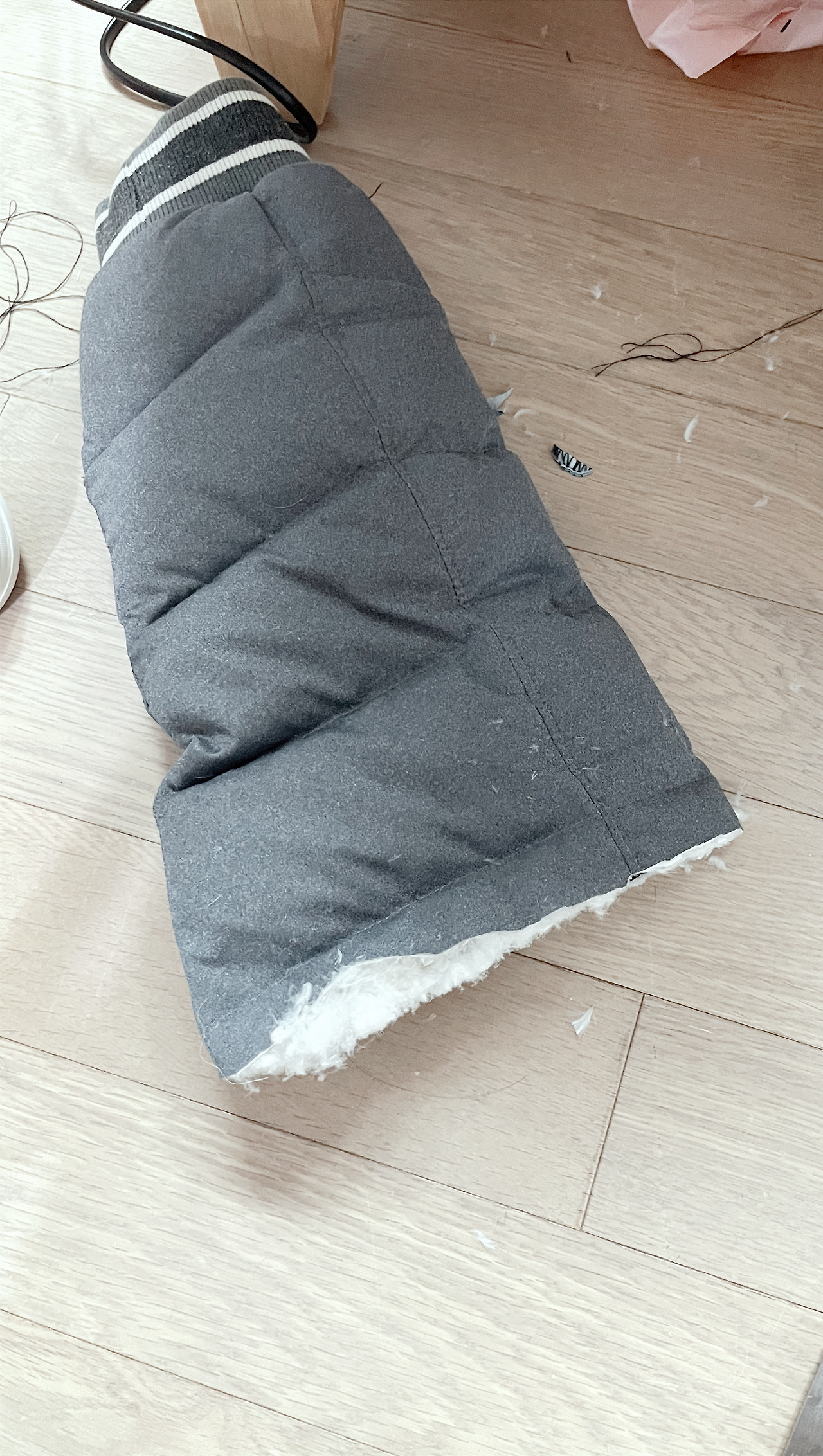 왕초보 재단사의 솜씨로 패딩은 조끼가 되고, 군데군데 땜질한 자국이 흥부네 강아지같네.