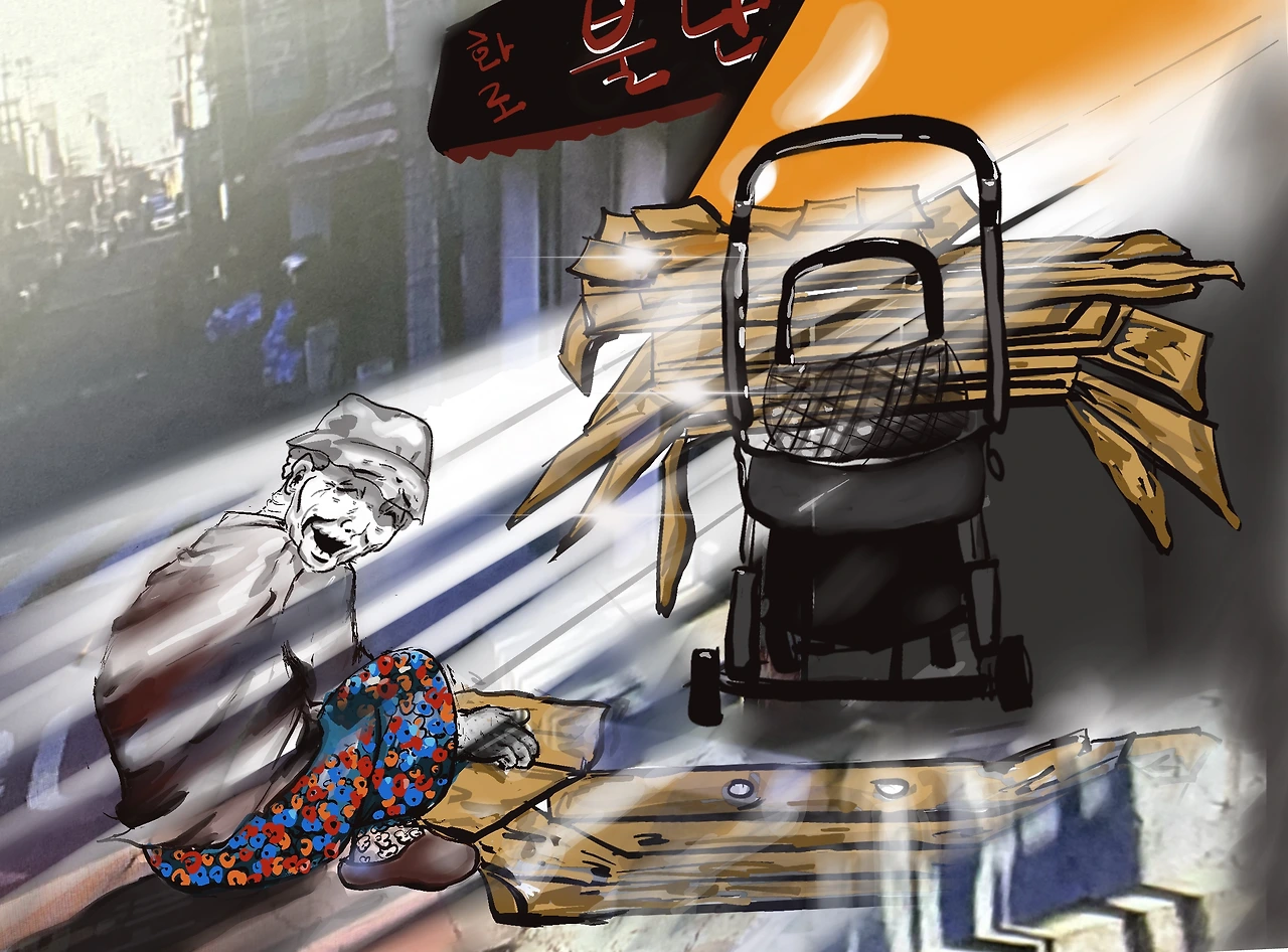 가게 밖에서는 믿을 수 없는 광경이 벌어지고 있었다. 양아치 놀부가 선행이라는 것을 하고 있었다. 폐지 사수대처럼 지키고 있었던 종이상자를 빵집 앞에서 봤던 꼬부랑 할머니의 유모차에 쌓고 있었다.