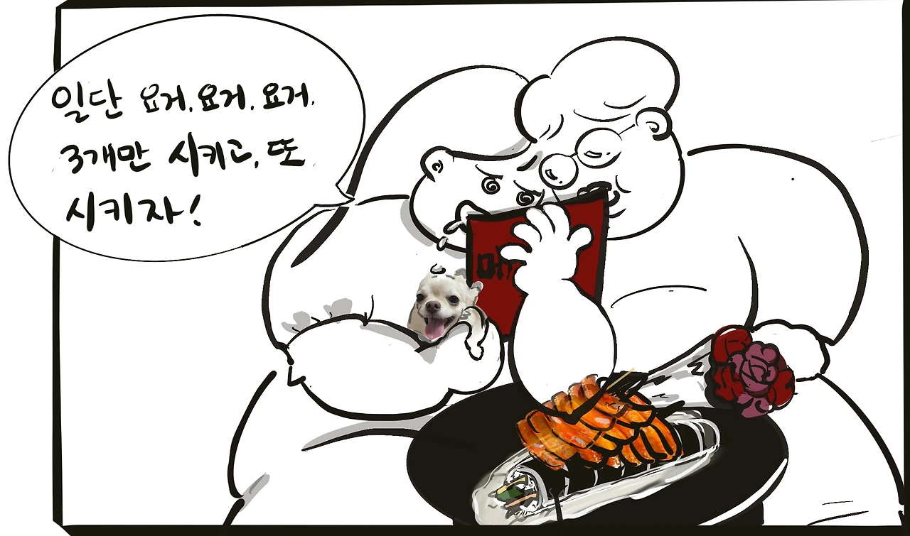 “ 어머 우리 파피는 너무 작아서 괜찮아요. 손님도 별로 없네 뭐, 금방 먹고 갈 거니까, 일단 요거 요거 요거만 먼저 주세요. ”
