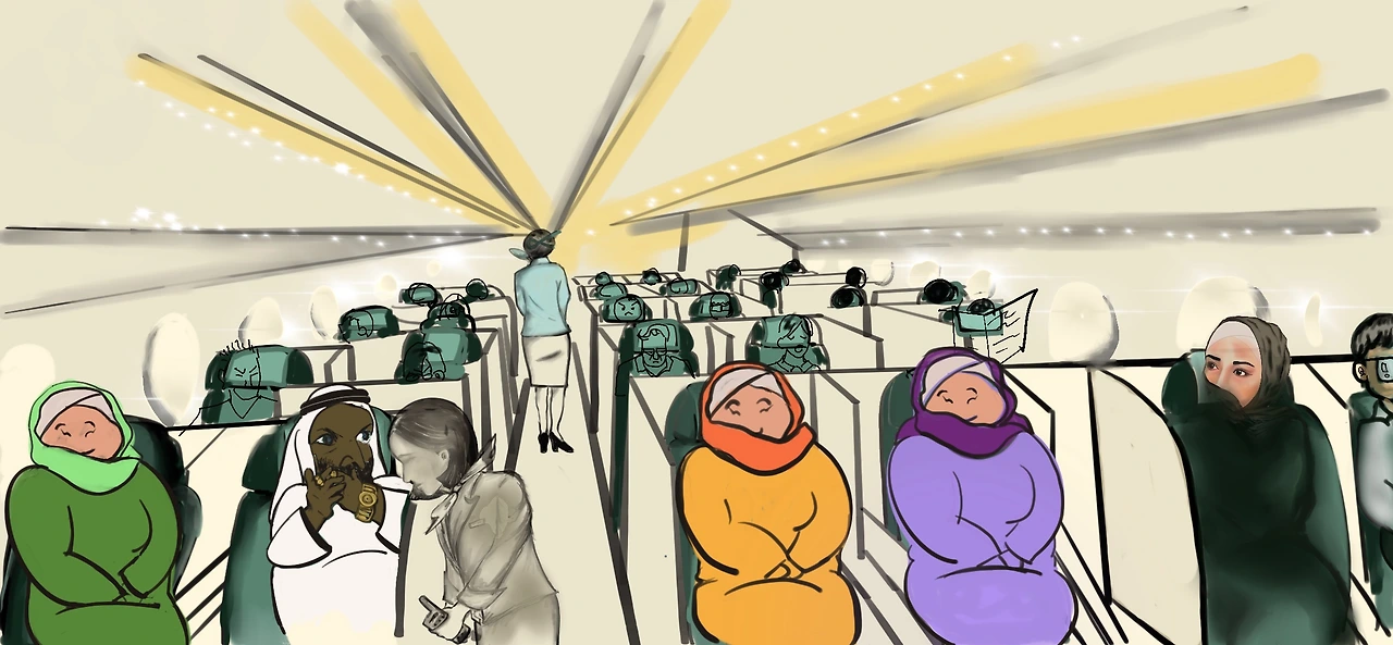 “ 고객님, 정말 죄송합니다. 히잡을 두른 저분들이 종교적인 문제로 남성 승객과 나란히 앉을 수 없다고 합니다. 괜찮으시다면 10J 창가 좌석으로 변경이 가능하신지요? “
