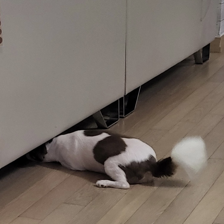 소파 밑에 떨어진 간식을 발견하고는, 꺼내 먹고 말겠다는 의지로 고군분투하는 중이었던 것이었다.