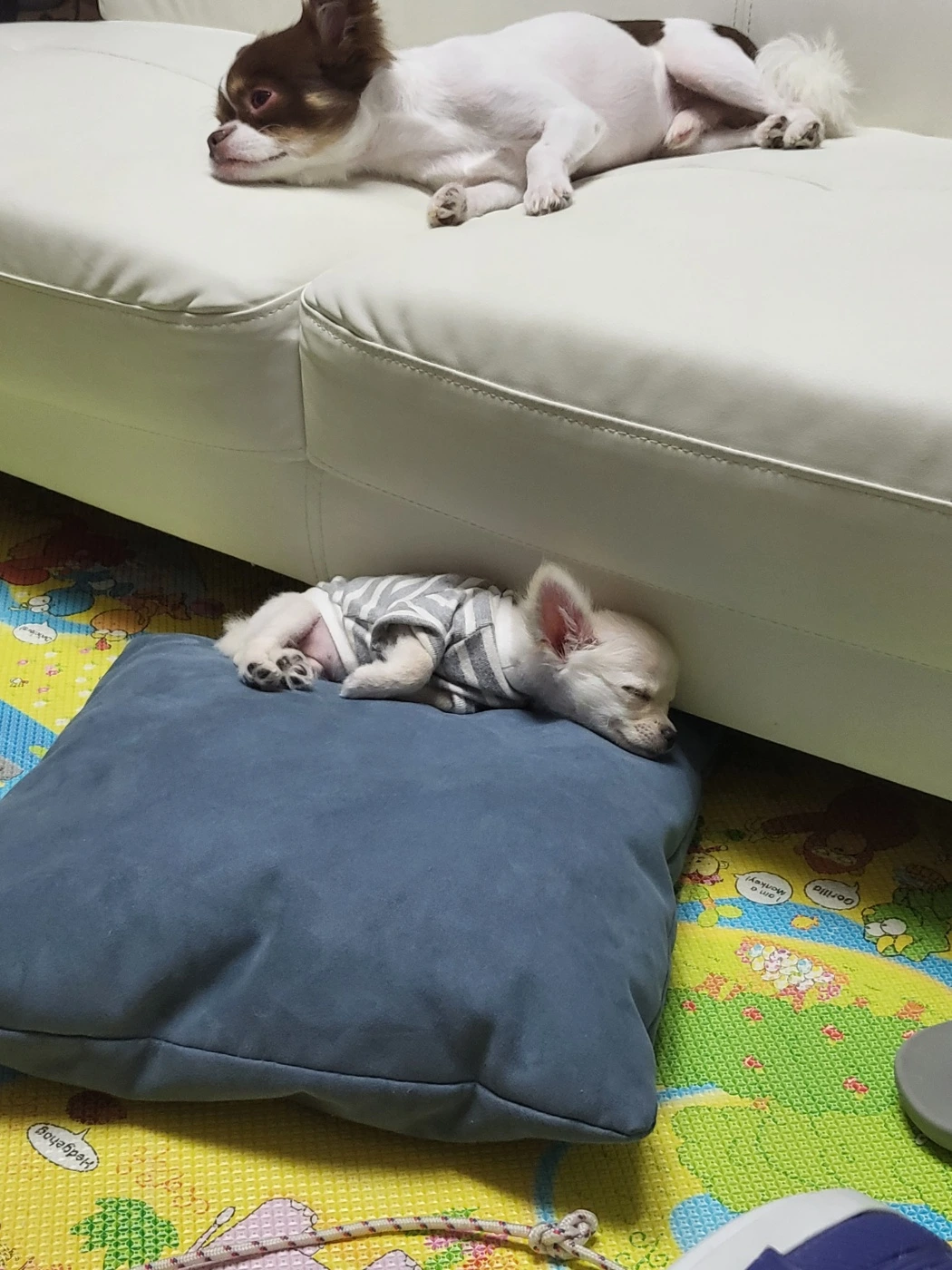 여전히 몸은 어딘가에 끼워서 자는 것을 선호하는 쫑이는 뚱마의 몸에 끼어서 자는 것을 좋아하는데,