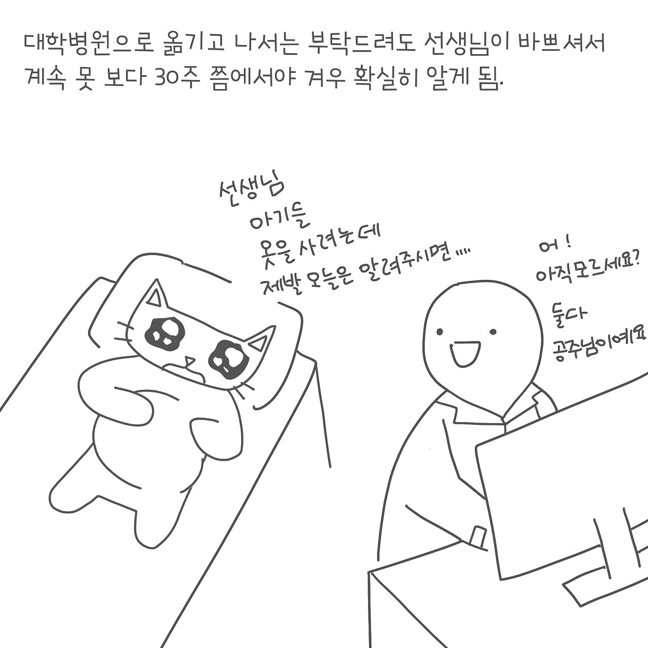사실 태몽이 작은 동물들이었기 때문에, 왠지 딸둥이일 것으로 생각은 하고 있었는데, 난임 병원이라 그랬는지 성별을 잘 안 알려주시는 것 같았다. 그리고 마지막으로 난임병원>대학병원 전원 전에 본 초음파에서 선생님이 왠지 내가 남매 둥이면 좋을 것 같다고 하는 말에, 아니면 어떡하려고 그러시냐며 깜짝 큰소리를 내셨는데… 그때는 대체 선생님이 왜 그러실까! 했는데 이제 생각해보니 그냥 둘 다 딸둥이임을 알려주신 것이었던 것 같다. ㅎㅎㅎ 아무튼 그때는 그렇게 생각하지를 못해서 그냥 애매하게 둥이들 옷도 못 사놓고 누가 물어봐도 아직 정확히 몰라요..!!라고만 대답을 했었다.