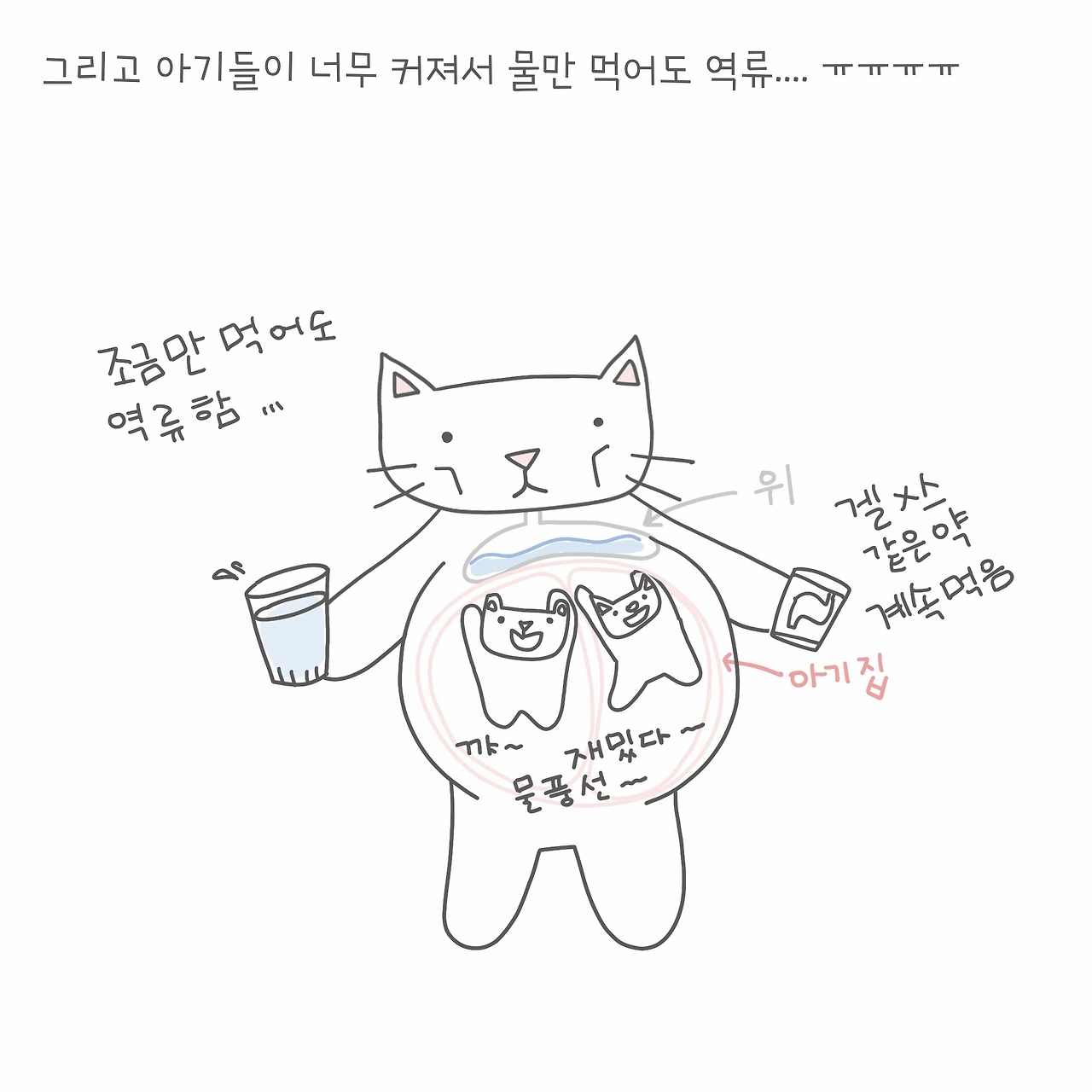 잘 때는 그랬고, 깨어있을 때 나를 괴롭혔던 것은 역류였다. 정말 자궁이 일단 그렇게 커진다는 것도 정말 신기한 일이지만, 커진 자궁이 내 위까지 압박해서, 뭐만 먹었다 하면 물만 먹어도 그냥 항상 식도에서 먹은 것과 위액이 찰랑찰랑한 느낌이었다! ㅠㅠ 너무 불쾌하고 쓰라렸다… 그래서 겔 x스 같은 위산 역류 약을 달고 살아야만 그래도 지낼만했다. 마지막에는 출산날만 손꼽아 기다렸다!