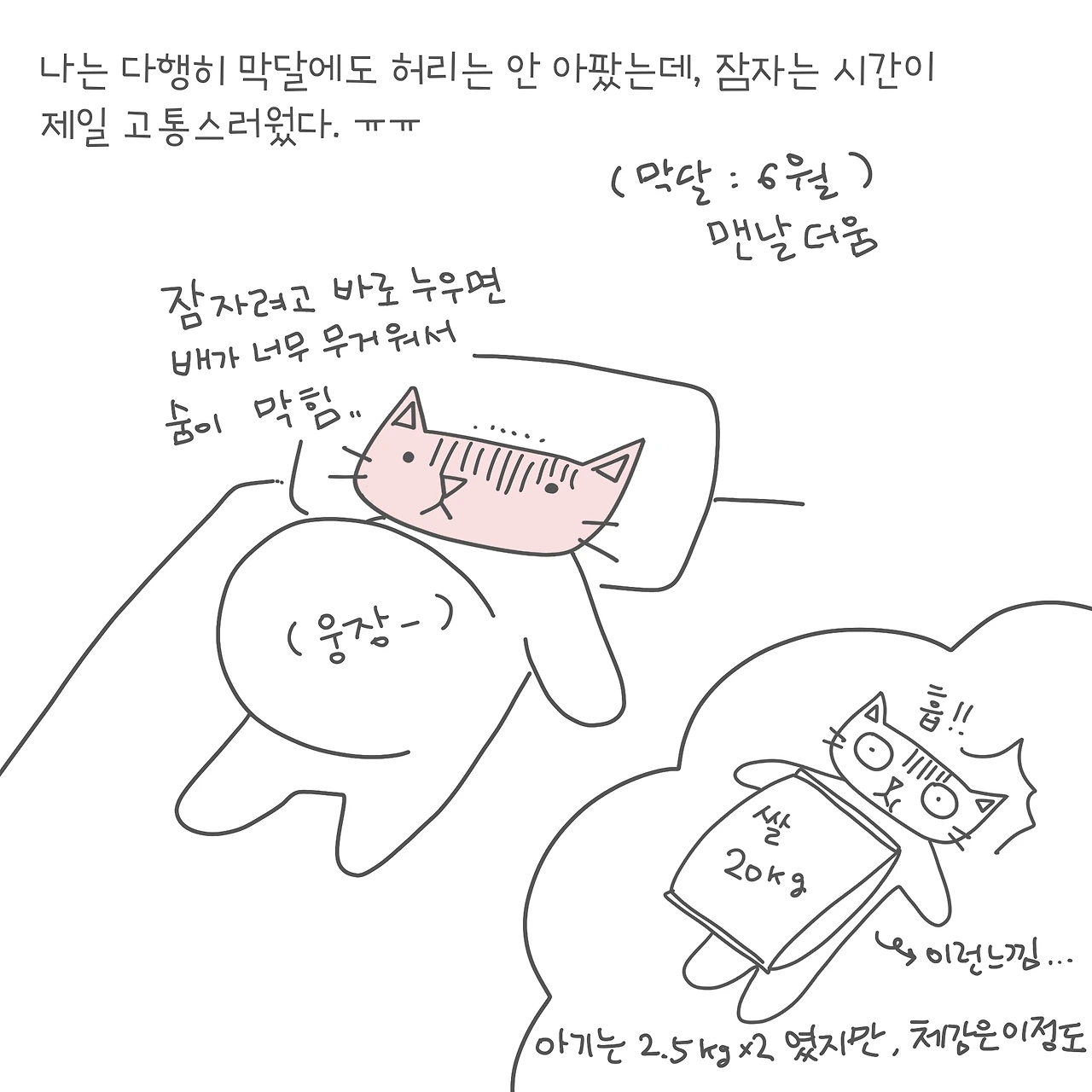 막달 전까지 회사를 다닐 때만 해도 그냥 배가 좀 무겁다 정도였지, 힘든 포인트들은 별로 없었는데, 막달이란 굉장한 것이었다. 다리도 퉁퉁 붓고, 배는 정말 커질 대로 커져서 잠시 후면 찢어질 것만 같았다. 그리고 잘 때는 정말 쌀가마니를 배에 올려놓은 것 같이 무거워서 숨이 잘 안 쉬어지는 느낌이었다. 하지만 옆으로 누워서 자도 불편한 것은 마찬가지였고, 그래서 막달에는 잠도 좀 설쳤던 것 같다.(원래는 누가 업어가도 모르게 잘 잠)