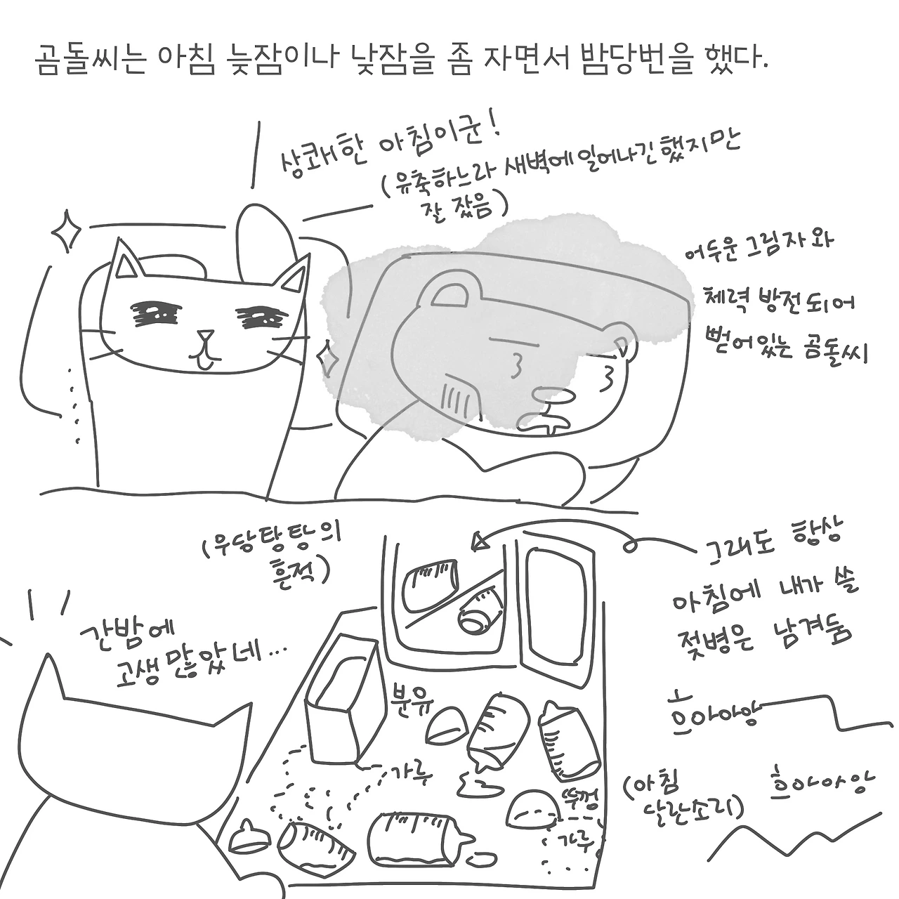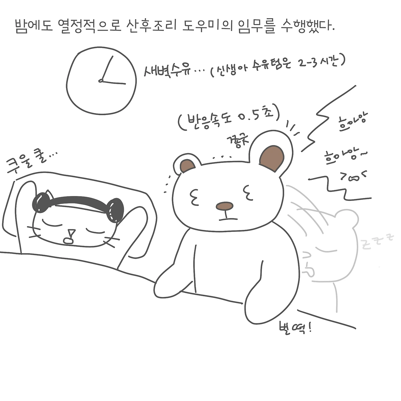 초반에 아기를 키울 때 제일 힘든 부분이 부모가 잠을 푹 잘 수 없는 부분인 것 같다. 평소에도 하루 이틀 잠이 부족하면 좀 우울해지고 쳐지는 느낌인데, 아기가 ‘통잠’을 자기 시작하는 100일? 혹은 그 이후(우리 집은 110일이 넘어서 였던 것 같다)까지 잠을 설치게 되면 기분 변화가 있을 수밖에 없을 것 같다. ㅠㅠ 남편이 수일간 회사 휴가를 내고 낮에도 아기를 좀 보면서 밤 당번까지 힘들게 했던 것은 지금 생각해도 대단하다. 그리고 남편 스타일 상 매번 실험을 하면서 최적의 프로세스를 만들어서 되게 웃겼다. 매일 내가 아침에 일어나면 나에게 간밤에 얻은 꿀팁을 전수해주었다.